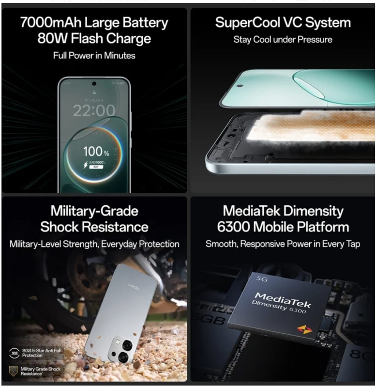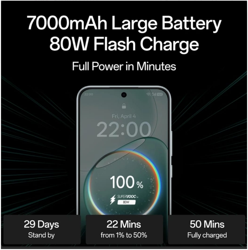 8GB RAM 128GB ROM | 7000 MAH BATTERY | 80 W FAST CHARGING | 120 Hz REFRESH RATE | 50 MP CAMERA | MEDIATEK 6300 PROCESSOR | 120 Hz REFRESH RATE